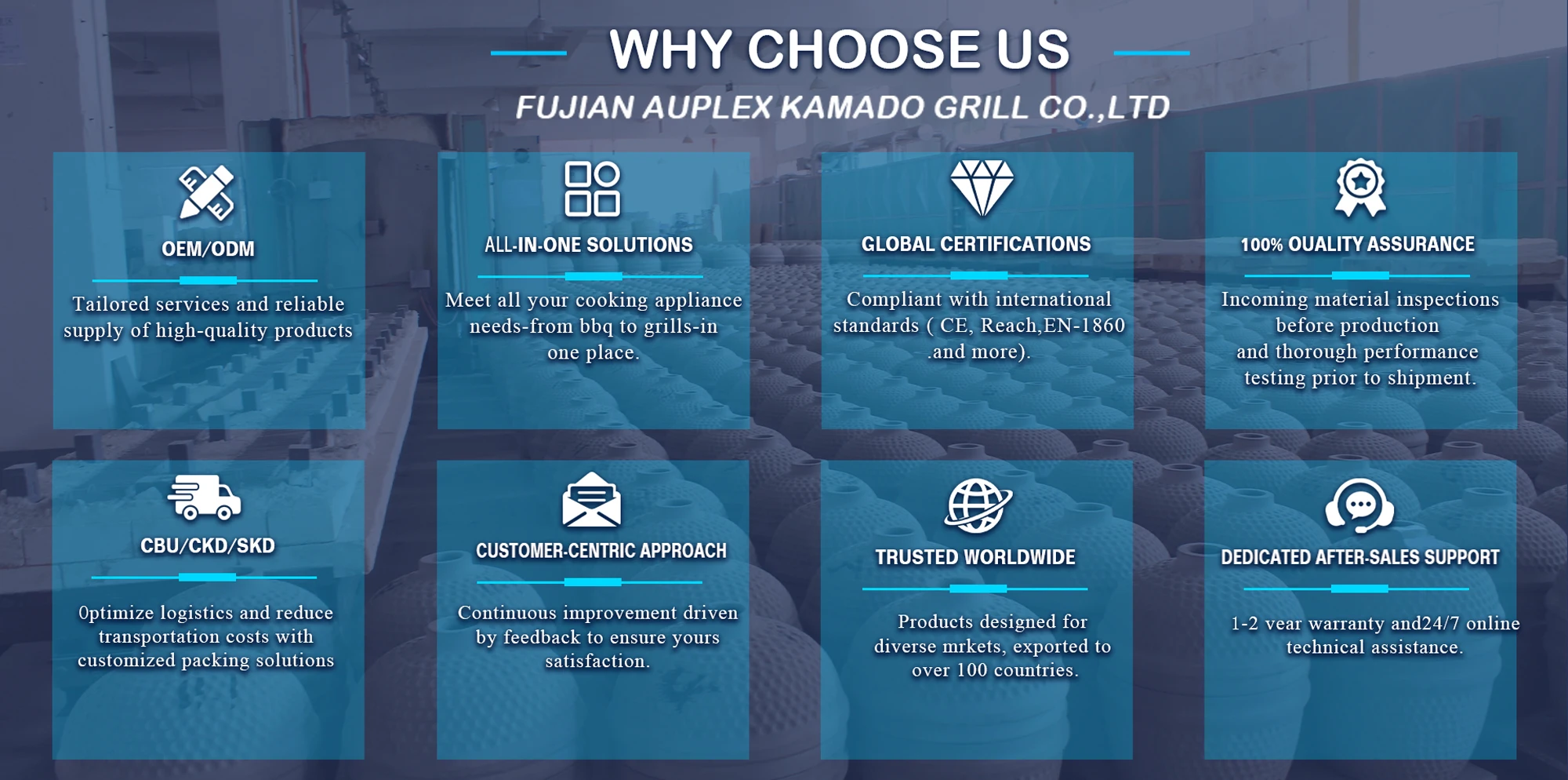 Auplex is the China top 1 ceramic grills manufacturer with 60000 Square meters factory plants, and coming with advanced equioments and technology as below;